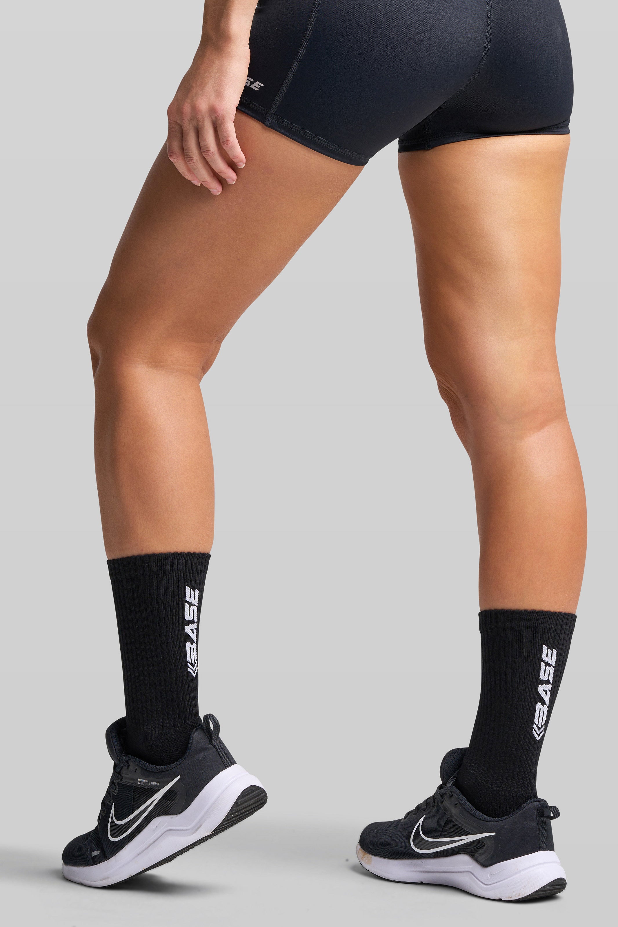 Performance crew socks designed for active lifestyles. These sleek black unisex crew socks combine comfort and functionality with a cushioned sole and mid-rise design that works for any athlete or active individual.